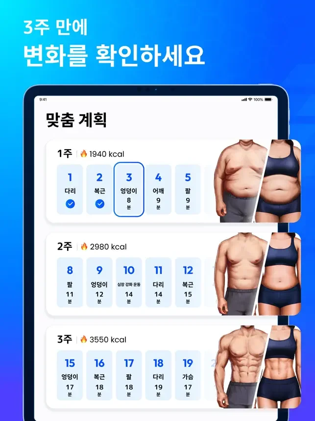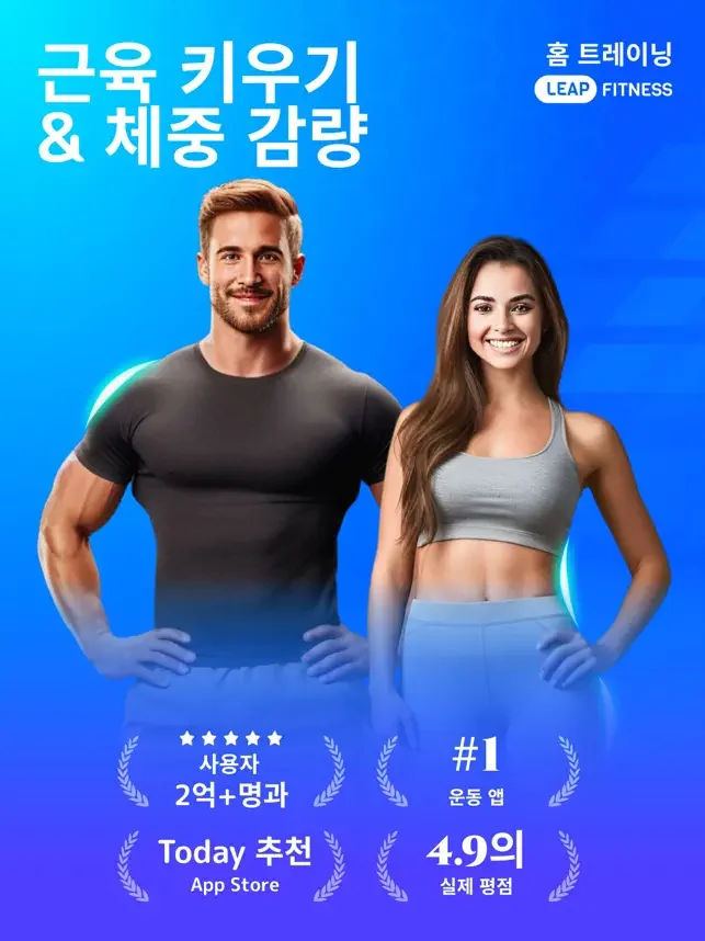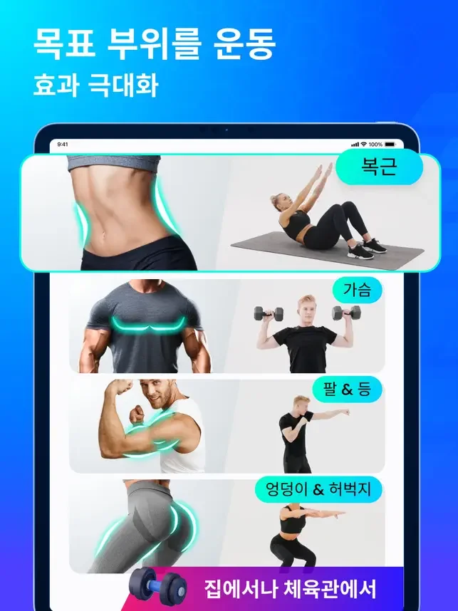 운동기구는 필요 없고 쉽게 따라갈 수 있어요. 집에서, 헬스장에서, 야외에서 홈 운동과 함께 언제 어디서나 운동할 수 있어요.
