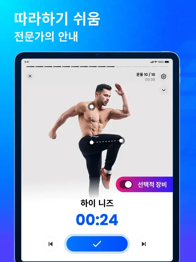 운동기구는 필요 없고 쉽게 따라갈 수 있어요. 집에서, 헬스장에서, 야외에서 홈 운동과 함께 언제 어디서나 운동할 수 있어요.