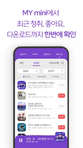 또한, 내가 좋아하는 방송과 에피소드를 저장하고, 청취 기록을 MY mini에서 관리할 수 있어 개인화된 라디오 사용이 가능합니다. 앱 시작 알람과 예약 종료 기능으로 생활 패턴에 맞춘 편리함도 제공합니다.