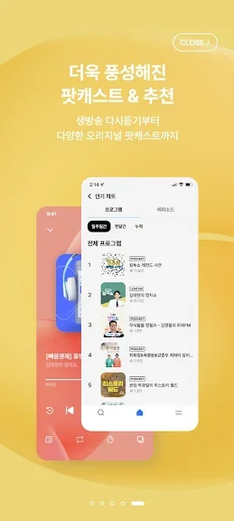 이 앱은 팟캐스트 오리지널 프로그램과 방송 다시 듣기 기능을 제공합니다. 청취 중 구간 이동, 속도 제어 등 다양한 옵션을 통해 맞춤형 청취 환경을 제공합니다. 방송 선곡 리스트와 연결 기능으로 좋아하는 음악을 놓치지 않고 즐길 수 있습니다.