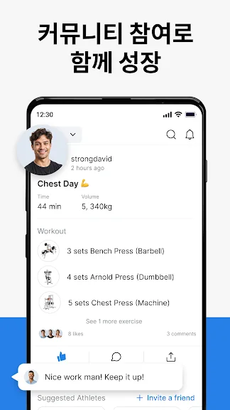 피드를 통해 수많은 사람들과 연결될 수 있어요! 서로를 팔로우하고 공유하고 소통하며 응원해보세요. 서로 긍정적인 자극이 되어 더 꾸준하게 운동을 할 수 있어요. 같은 목적을 가진 사람들과 소통하고 서로의 운동 루틴을 공유해보세요. 체중 감량, 다이어트를 원하는 사람들끼리, 3대 운동 증량을 원하는 사람들끼리!