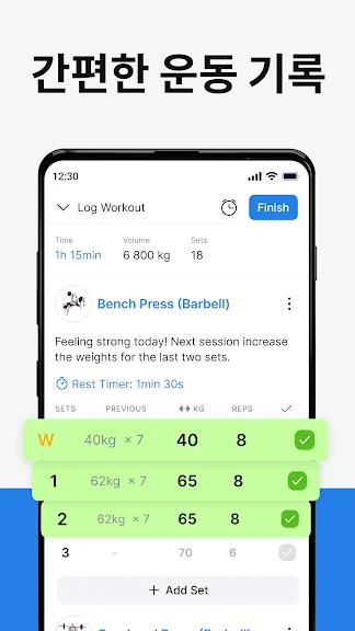 펜과 & 종이는 필요 없음 - 각 세트의 중량 및 반복을 연속으로 기록하거나, 모든 세트를 한 번의 클릭으로 기록합니다. 저희가 여러분의 데이터를 저장 및 추적하고, 트레이닝 결과를 직관적인 통계 및 표를 사용해서 한눈에 보여 드립니다.