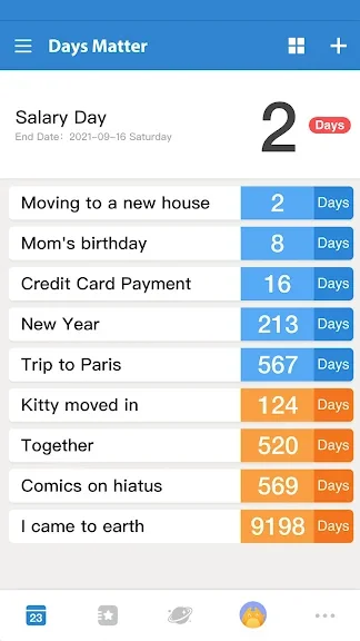 멀리 가족의 생일에서 얼마나 많은 일 : 일 물질과 같은, 중요한 일 카운트 다운하는 응용 프로그램입니다? 때 신용 카드를 지불? 당신의 월급 날에서 얼마나 많은 일이 있습니까? 아기가 태어난 이후 얼마나 그것은이었다?