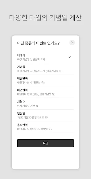 생일, 커플 기념일, 결혼 기념일 등은 물론 시험, 수능 등 각종 디데이 날짜 자동계산.