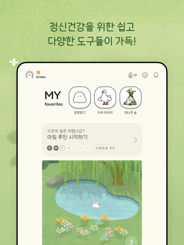 귀여운 콰블 오리를 만나보세요! 당신의 사랑스러운 동반자이자 안내자가 되어 매일매일의 정신 건강 여정을 함께하고 일상의 기쁨을 더해줄 거에요. 이 세심하게 설계된 기능은 불안과 우울증을 극복하는 데 도움을 줍니다. P.S. 오리를 쓰다듬어주고, 트릭을 즐기며, 파크를 꾸미고 친구들을 만나보세요. (콰블 오리 친구들이 가끔 서프라이즈로 등장할 수도..?)