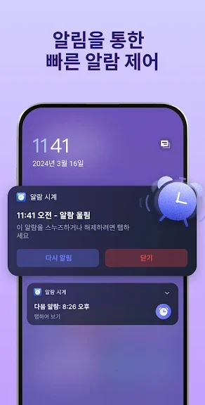 ♪ 알람이 울리기 전에 일어나면 설정된 알람을 쉽게 비활성화할 수 있습니다.