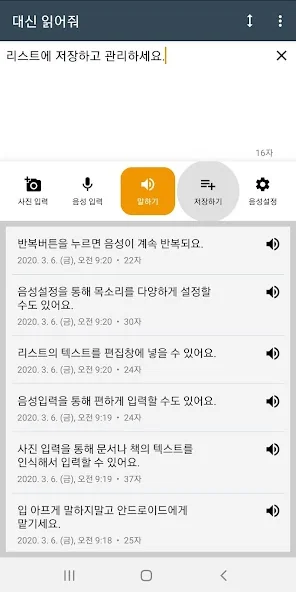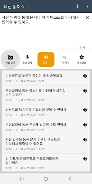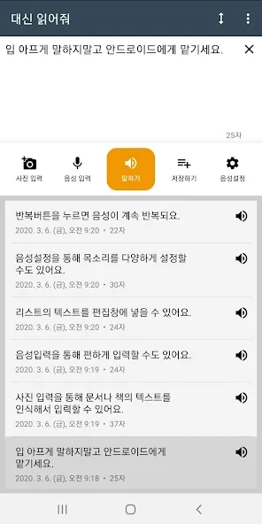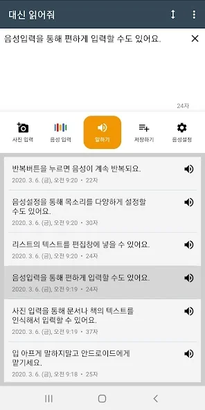 아래는 대신 읽어줘: 텍스트 음성 변환 어플에 대한 스크린샷 정보입니다.