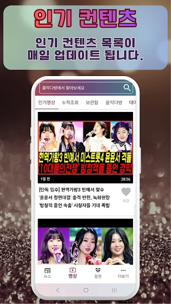 이 앱은 쉽고 직관적인 화면 구성으로, 누구나 편하게 사용할 수 있어요. 좋아하는 곡을 저장하거나, 인기순이나 가수별로 찾아볼 수도 있고, 새로운 영상 알림도 받아볼 수 있어서 항상 신선한 콘텐츠를 놓치지 않게 도와줍니다.
