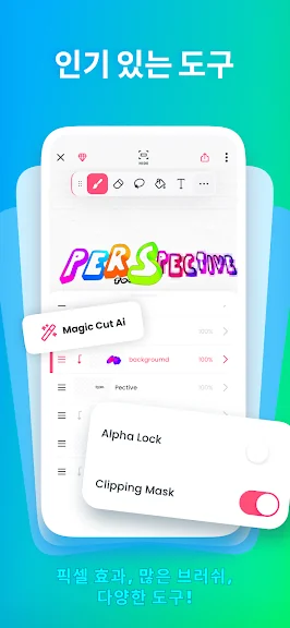 • 무료 툴인 브러쉬, 라소, 필, 지우개, 도형자, 미러 툴, 다양한 폰트로 텍스트 넣기로 아트 만들기!